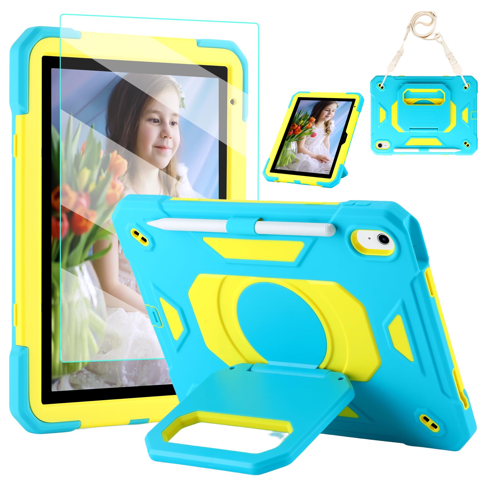 Case for iPad (A16) 2025 11th Gen 10.9'', iPad 10th Generation 2022 10.9'', with Tempered Glass Screen Protector, Rugged Kid Case with Shoulder Strap/Pencil Holder/Folding Stand (Blue+Yellow). Now 29% off โ $16.70 (was $23.51).