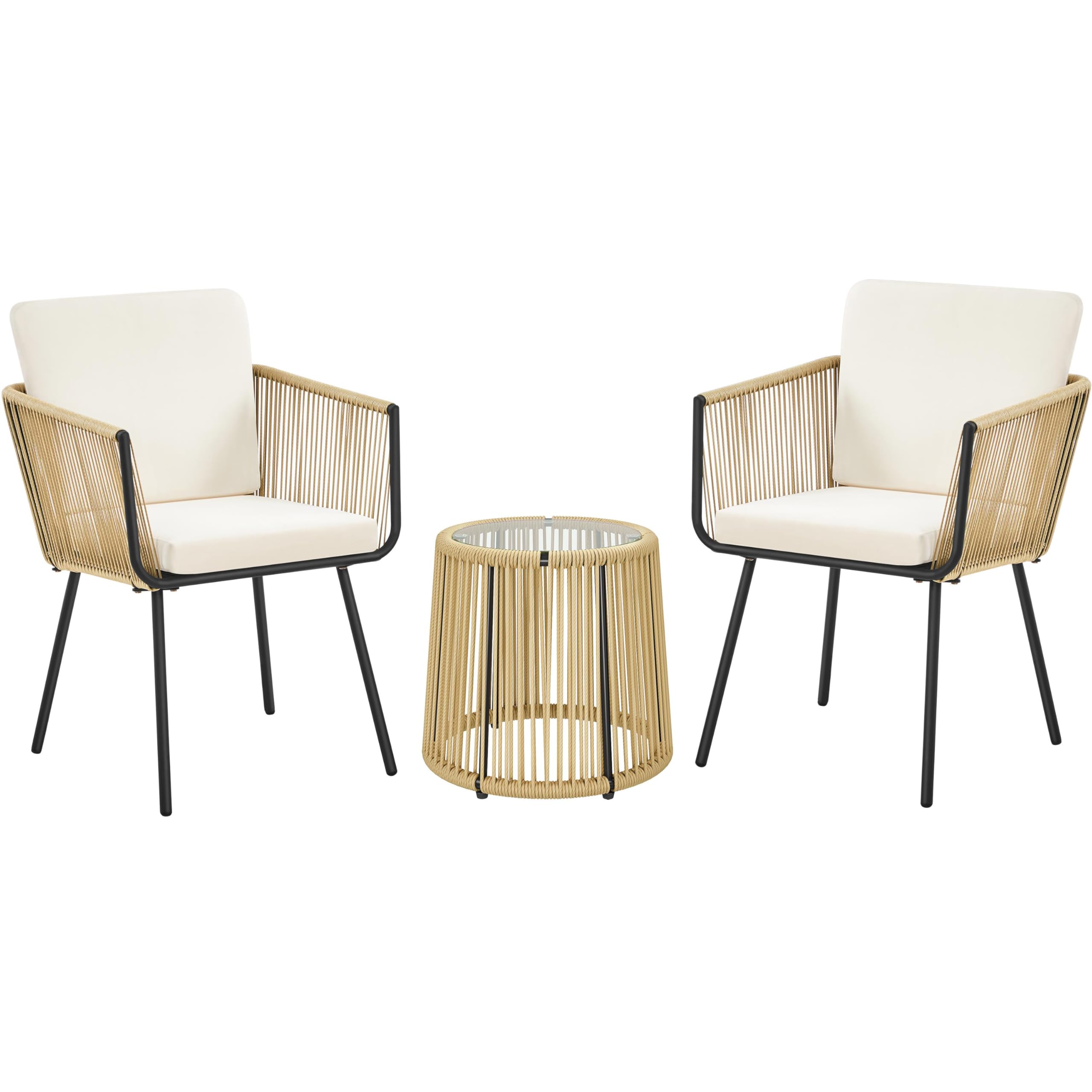 Yaheetech 3 Piece Patio Rattan Bistro Set, Outdoor All Weather PE Wicker Conversation Furniture Set with 2 Chairs & Tempered Glass Top Table & Cushions, for Poolside/Porch/Garden/Yard, Tan/Cream — $109.98 | Nab 'n Buy
